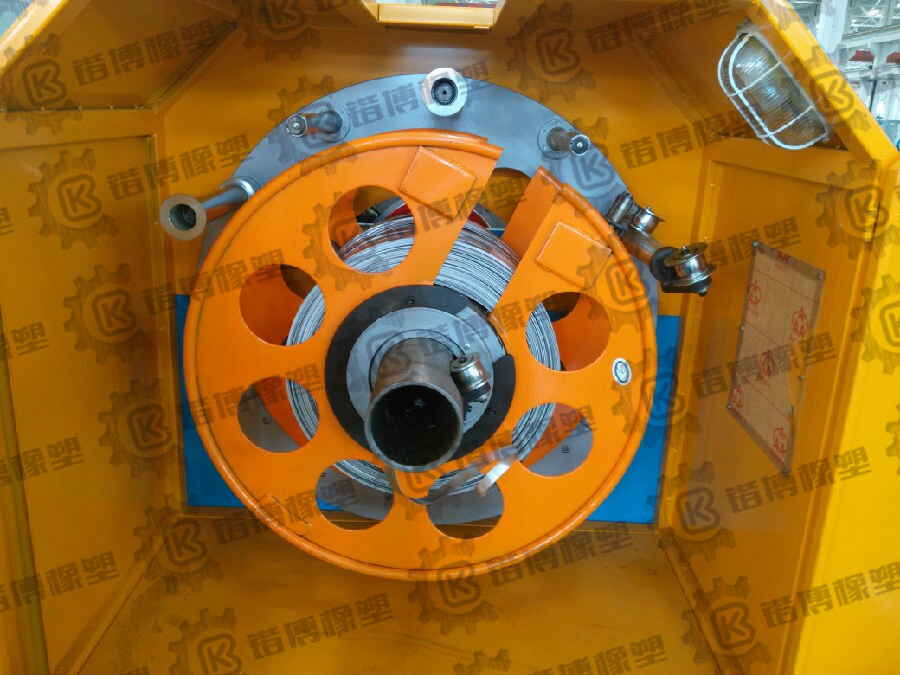 4.2.5?主機的中心裝有兩根不銹鋼中心管一根與主軸連接在一起,起到輸送鋁帶作用。另一根內中心管固定不轉,為避免電纜線在鎧裝過程中擦傷,設備在進線端裝有聚四氟材料的定位模塊,用于保護和固定電纜線。